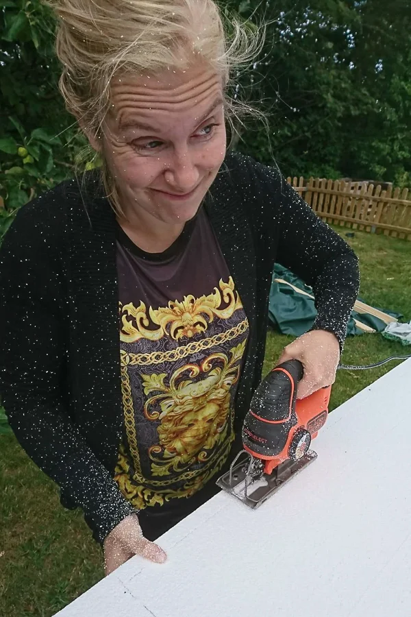 Det hamnar ÖVERALLT! Vi kom på den briljanta idén att såga ut bitarna med sticksågen med istället för och hålla på och skära med kniv. Det var frigolitsmuls-bonanza kan jag säga. Det blir ju statiskt, och fäster sig vid hud och kläder trots att det blåser. Som synes.